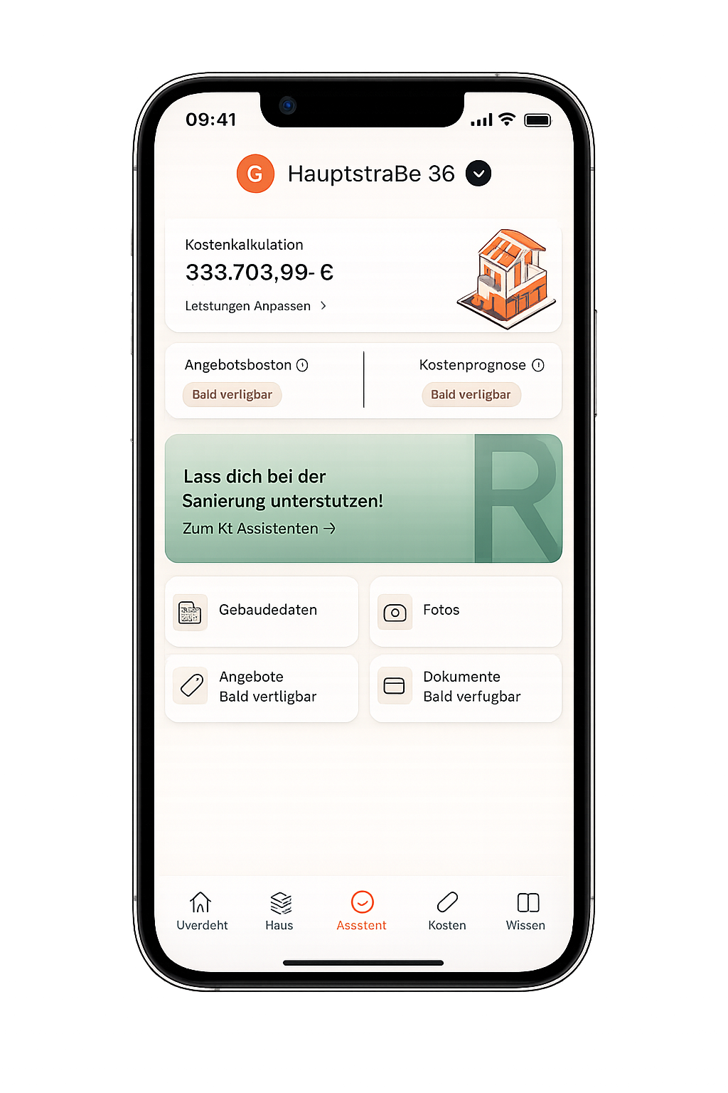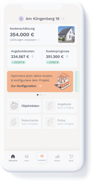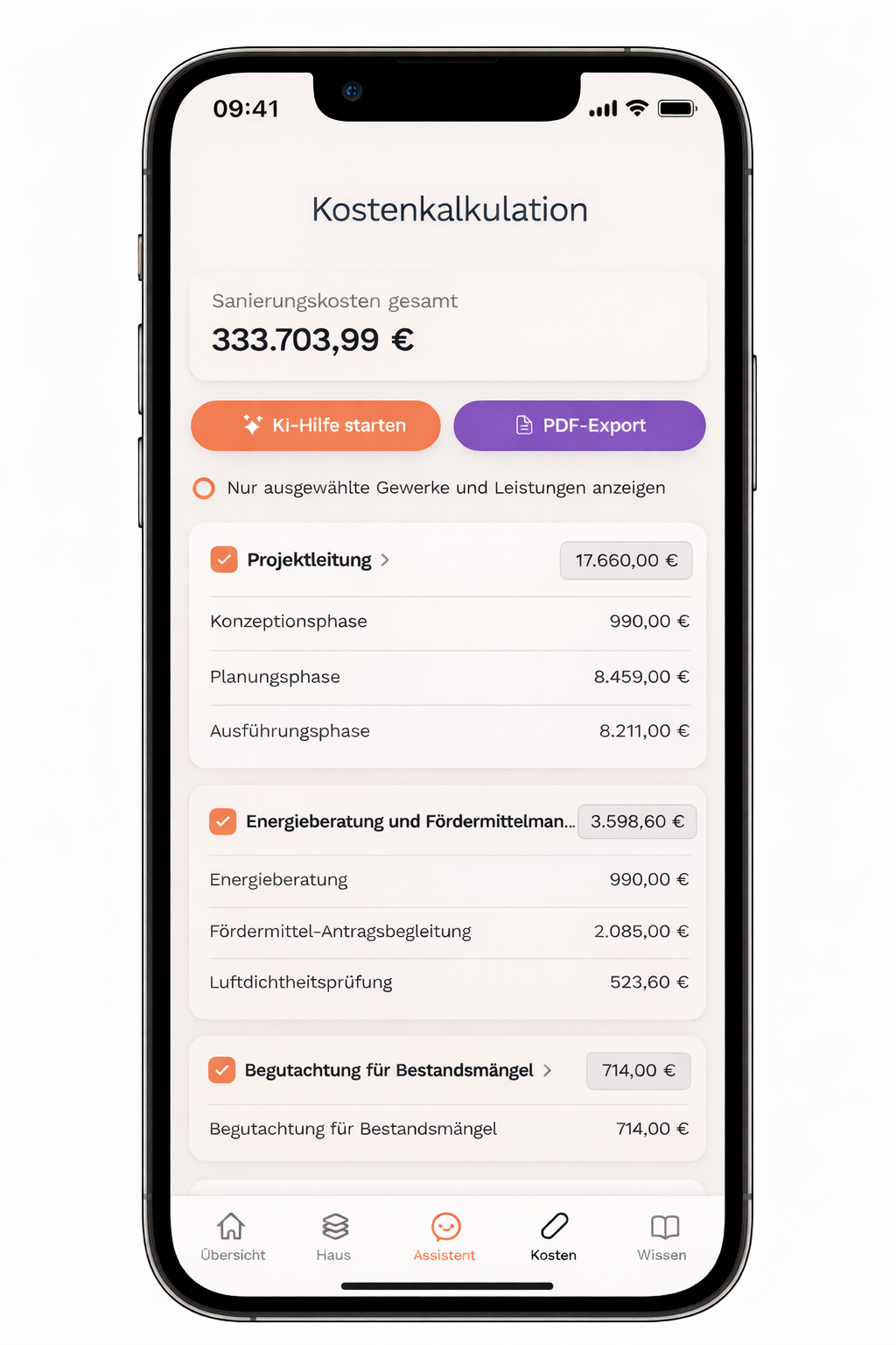 Strukturierte Kostenschätzung inklusive professionellem PDF für Bank und Förderung.