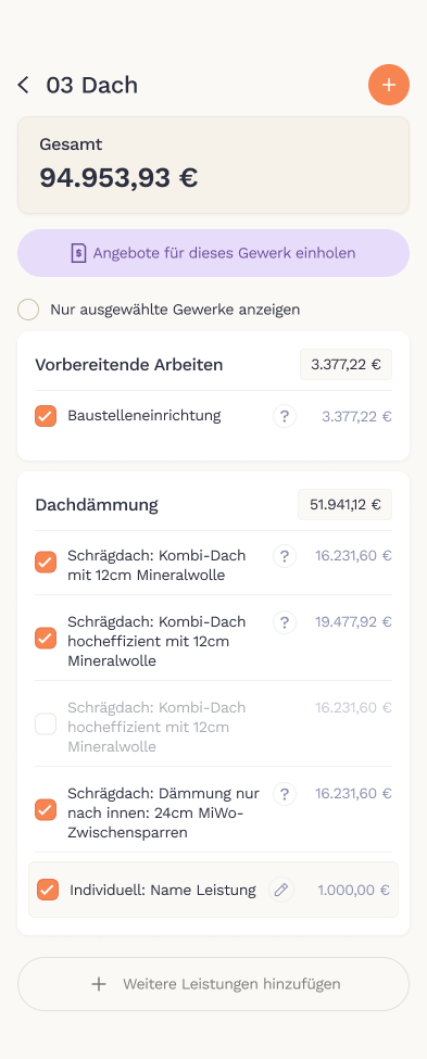 Leistungen auswählen, Varianten erstellen und Kosten automatisch berechnen.